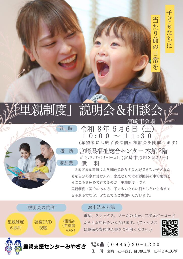 里親支援センターみやざき(0985-20-1220)までお気軽に問い合わせください。